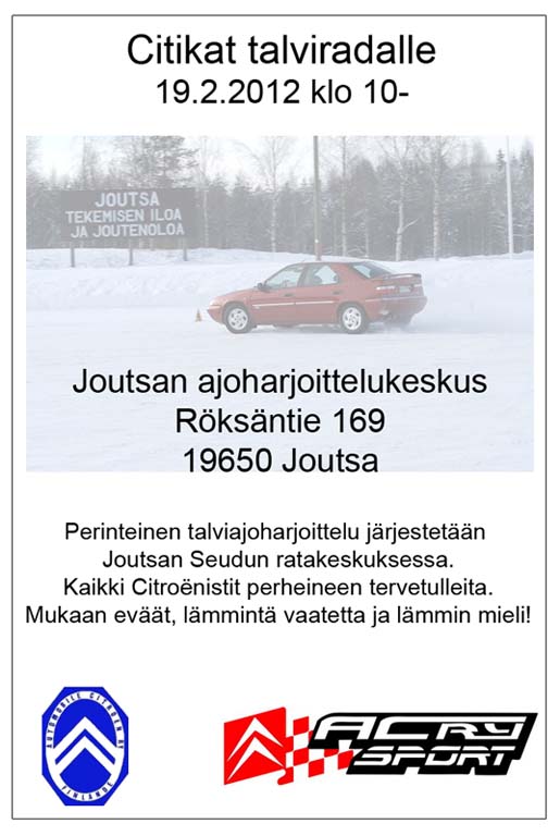 Automobile Citroën ry järjestää perinteiseen tyyliin kerholaisille talviajoharjoittelun Joutsan ajoharjoittelukeskuksessa ( http://www.joutsa.fi/ratakeskus/). Ohjelmassa perinteisiä auton hallintaan liittyviä väistö/pujottelumanööverejä, puheensorinaa, makkaranpaistoa, palelemista ja kylmiä varpaita (jälkimmäiset ei liity auton hallintaan). Tapahtuma alkaa noin klo 10, paikalle saa tulla pitkin päivää, mukaan omia eväitä (makkaranpaistomahdollisuus on) ja lämmintä vaatetta sekä viiksikulkineita. (lumilapio, hinausköysi...) ps. tapahtuman tavoitteena ei ole ralliajo, vaan turvallinen tutustuminen auton käyttäytymiseen ääritilanteissa. Tervetuloa! t: Timo