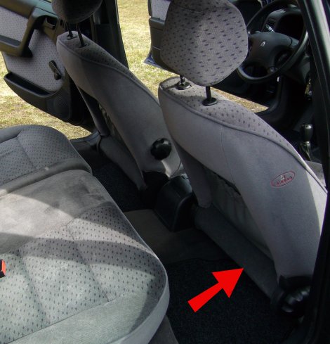 Liitteenä olevassa kuvassa nuolen osoittamasta paikasta löytyy myös vaihtoehtoinen kiinnistyspaikka. Etuistuimen takapuolella alareunassa on kankainen suojus, jonka alla on tukeva poikittaisrauta, johon turvaistuimen remmit saa kivasti kiinni. Tuonne kiinnitetty turvaistuin ei haittaa etuistuimen eteen/taakse säätöä ja etupenkillä on jälleen ilo matkustaa 8-)