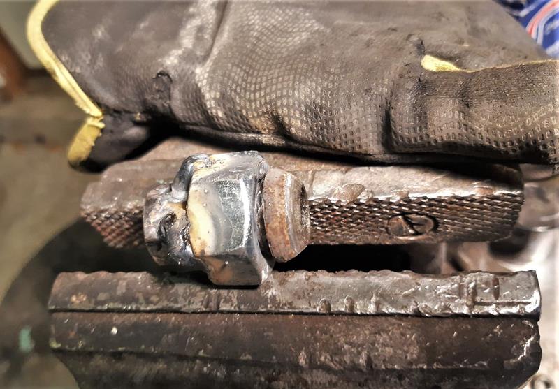 Mutteri lähti irti, kiitos kaikille vinkkejä antaneille! Ajoin Norhtstarin ohjeen mukaa mutterit löysättynä n 20km lenkin ja nostin kärryn hyvälle työskentelykorkeudelle. Hitsasin ison mutterin alkuperäisen 17mm kiinnitysmutterin päälle, siitä ei kuitenkaan pystynyt kääntämään hylsyllä kolon ahtauden vuoksi, mutta siihen jatkeeksi sain hitsattua 19mm mutterin, josta pulttikoneella iskemällä mutteriyhdistelmä irtosi. Varmaankin tuo ajolenkin tärinä yhden mutterin varassa ja hitsauksen lämpö saivat jotain eloa vanteen ja mutterin kartion liitoskohtaan.