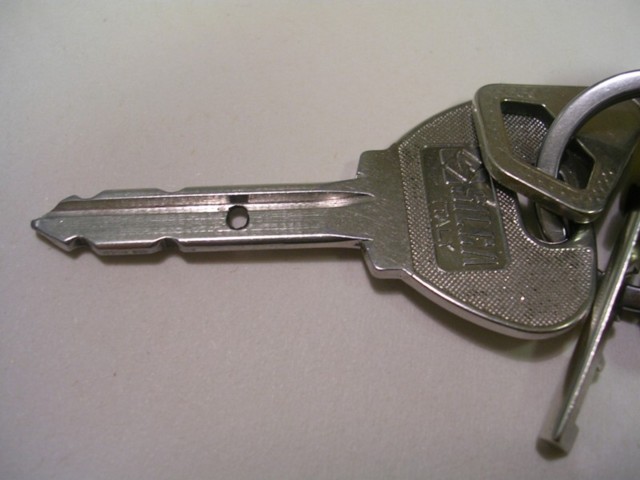 Tuohonkin on r_a_n_u konstinsa  .Kuvassa Bx vanin alkup. lukon itse tehty avain. (Ei muuten vaatinut hirmusti viilaajan taitoja, mutta rei'än täytyy osua juuri oikeaan paikkaan)  Ahaa. Joku tappiko sieltä tulee sitten reikään, jotta avain pysyy paikallaan? Tosin ei tuo usein eteen tuleva vika ole, mutta helppo on todeta. Ja katsastusta ei läpäise.