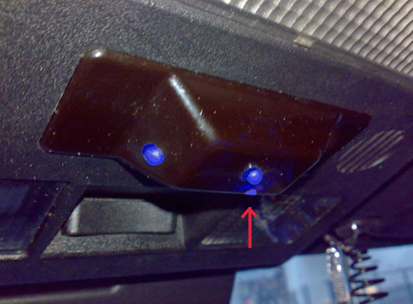 Tiedoston kommentti: Kattokuvussa vasemmalla kuskin jalkatilan & virtalukon lisäsisävalo-LED, keskellä alas vaihdekepille vastaava. Punainen nuoli osoittaa himmeänä kuvun lasin läpi hohtavaa virtalukon takana olevaa keskikonsolivalaistusta.