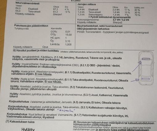 Kävin tänään katsastuksessa femman kanssa  Nuo korjauskehotukset menee oman huolimattomuuden piikkiin kun ei ole tullut katsottua rekisterikilven valoja eikä myllytettyä umpioita. Löytyi kuitenkin pari oikeata vikaakin:  Silti ei tullut mitään huomautusta kynkän laakerista, vaikka oikealta puolelta kuuluu pauke jokaisen töyssyn kohdalla. Odotan inspiraatiota sen vaihtamiseen. Mistä muustakaan tuo ääni voisi tulla? Pelkään, että alapallo voi olla tiukassa, vaikka hommasinkin työkalun sitä varten.