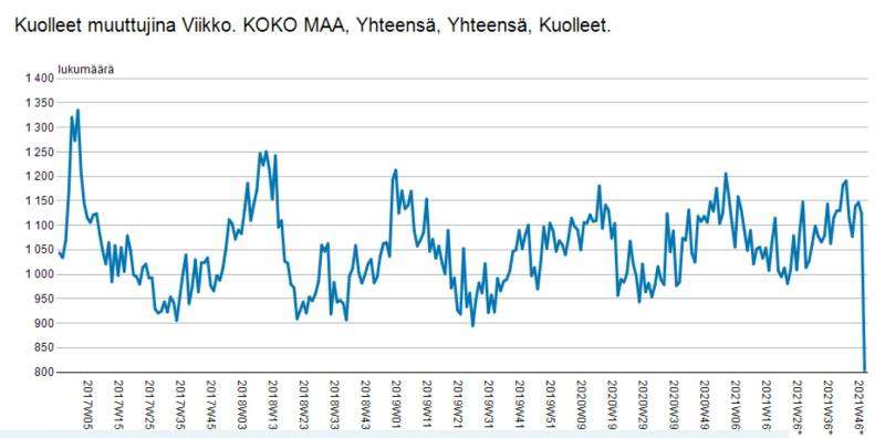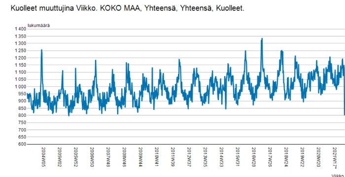 Xantippa kirjoitti: Latasin Tilastokeskuksen sivuilta 2014- tähän päivään kuolintilastot. N. 1030 keskimäärin viikkokuolleisuus. Tämän vuoden viimeinen puolisko vko27-47 keskiarvo tähän mennessä 1106. Tuosta tulisi n. 4000 ylikuolleisuus vuodessa tällä vauhdilla. Tässä linkki josta jokainen voi ladata tilaston ja todeta saman itse. https://pxnet2.stat.fi/PXWeb/pxweb/fi/K ... ewLayout1/Katsoitko olleenkaan historiaa? Vaihtelua on ollut vaikka kuinka paljon. Kun käppyrää katsoo kokonaisuutena, niin näkee heti, ettei siinä näy mitään dramaattista. Ei näy, vaikka monessa muussa maassa korona on oleellisesti nostanut kokonaiskuolleisuutta. Meillä ei näy korona, eikä rokotusten aiheuttama kuolleisuus. https://drive.google.com/file/d/1-KefhR ... sp=sharingTuosta voi itse kukin tiirailla tilannetta 2018 alusta lukien. Pieni tiputus lopussa johtunee tilastoinnin viiveistä.
