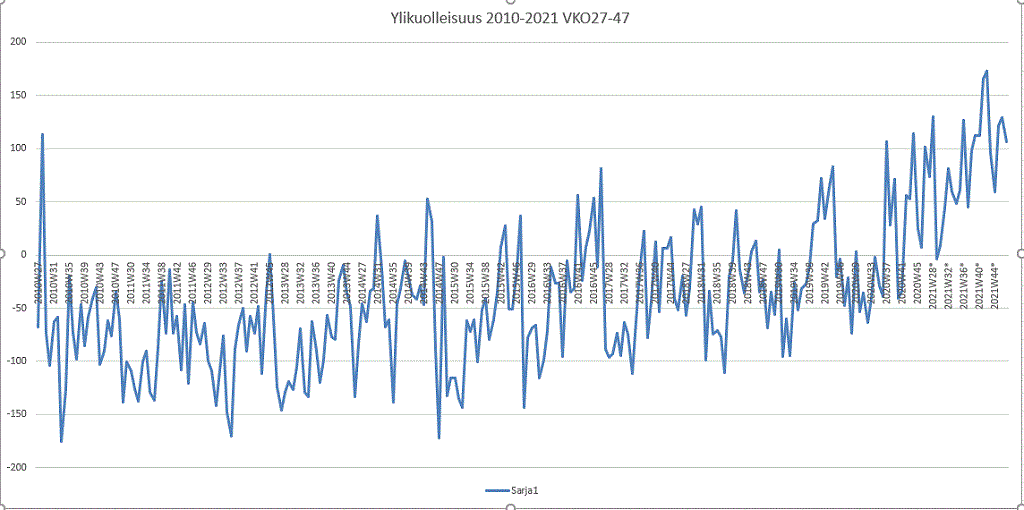 Tuossapa 2010-2021 VKO27-47 ylikuolleisuudesta käppyrä. Aika selvä trendi näkyvissä.