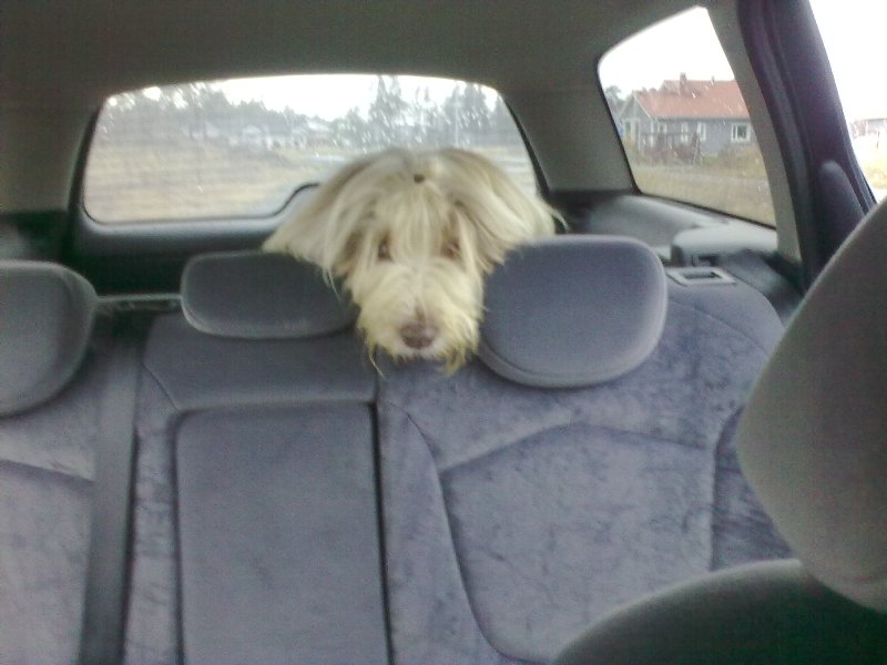Toinen matkustaa siinä saman puolen jalkatilassa viltin päällä, se on ahdas mutta itsepä on paikkansa päättänyt, on vähän arka koira eikä pidä vauhdista, kaupunkinopeuksissa voi kyllä tulla penkeille katselemaan. EI välttämättä kolarin sattuessa se koiralle turvallisin paikka, siksi penkin alla onkin vilttiä enemmänkin ettei kolarin sattuessa tarvi alkaa kaivamaan koiraa sieltä...