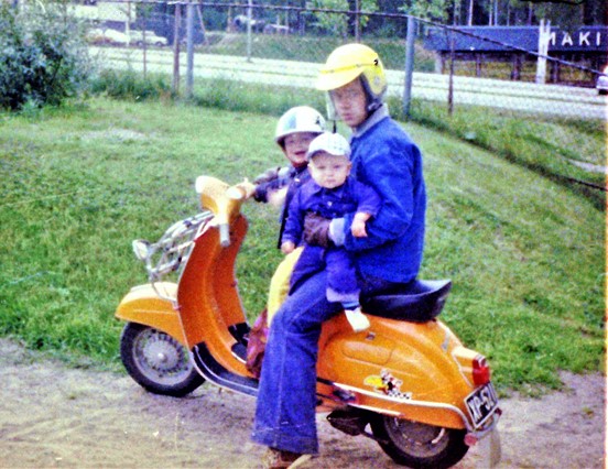 Vuonna 1975 ostin raksamopoksi Vespan. Kuvassa juuri lähdössä rakennushommiin ja pojat kinuamassa kyytiin. Tuohon etutelineelle kun pistin 50kg:n sementtisäkin niin oli aika raskas ohjattava.