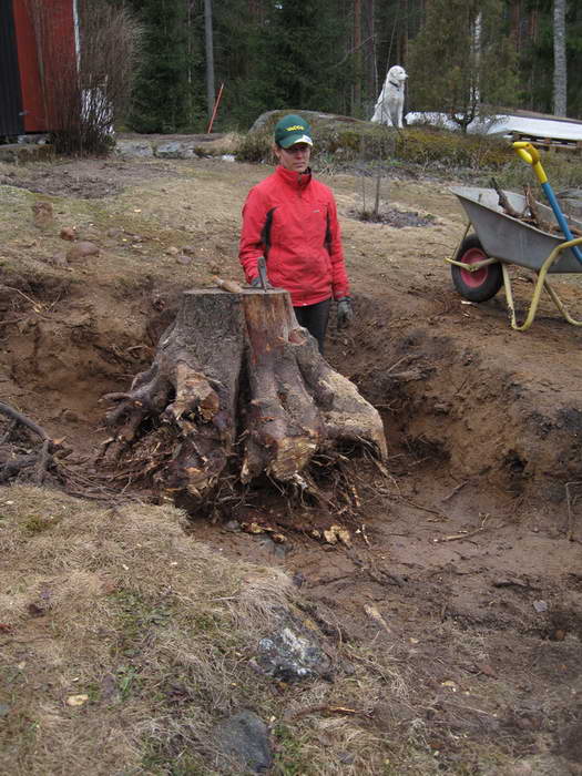 Emännän kanssa vähän pilkottiin yhtä koivun kantoa ja heitettiin se sitten sivuun. Siirtyi tuonne kuvaajasta poispäin.