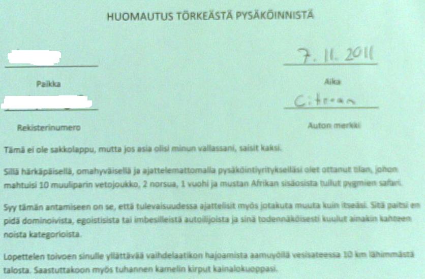 Lemon kirjoitti: Olen nähnyt muunlaisiakin yhdessä entisessä työpaikassani, joku närkästynyt hlö kiikutti sen toimistoon. Siinä tais olla Mikki Hiiren kuva ja teksti alkoi "Loistoparkkeeraus..." Ja päättyi "sinunlaisesi mulkun pitäisi käyttää julkisia liikennevälineitä" tms  Meille pöllähti kerran ruohonleikkurikuski naama punaisena meuhkaamaan töissä kun palkittiin se just tollaisella lapulla Mitäs jätti meidän ruutuun oven pieleen härvelinsä...