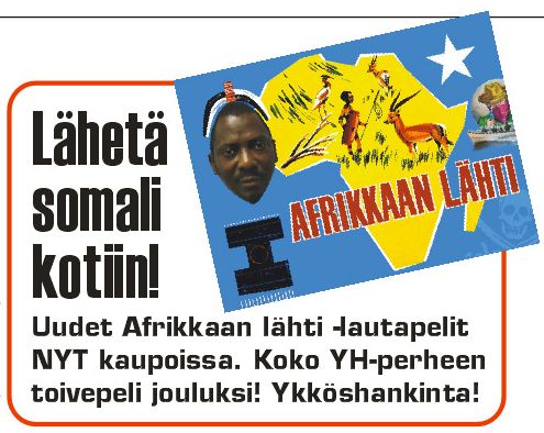 Mahtava toi "Afrikkaan Lähti" ...kumma ettei mode ole iskenyt koska kyse on melko rasistisesta aiheesta. Kerran oli viaton "pilin" kuva Putkimiehen viestissä niin jo lähti viesti ulkoavaruuteen