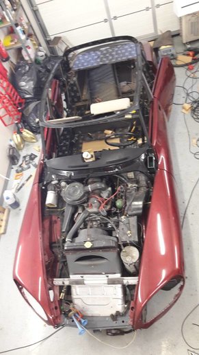 Auto maalattu, värinä Cx:n rouge metallic. Katto musta. Verhoilun väri on punainen. Ei ole tarkoitus tehdä mitään Pallas kopiota mutta löysin ao. verhoilun ( lattia ) edullisesti Ranskanmaalta ja pidin väristä. Ovet mustat, perusverhoilu / D super.