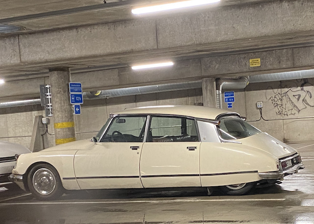 Onkohan tuo auto siihen aikaan nuorehkon naisen muuttoautona tuoma, jonkin ranskalaisen harrastajan vanha DSuper? Väri täsmää, samoin nuo tarvikelistat ja nahkasisustus. Huolsin sitä kerran Helsingissä 2000-luvun alussa, maadoitukset oli sekaisin ja toisen lampun korkeudensäätö rikki, se oli korjattu t-paidalla ranskalaisen käytännöllisen konstailemattomasti. Korjasin sen käytetyllä varaosalla.