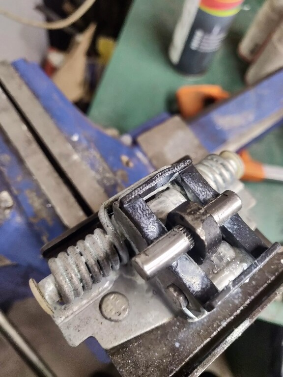 Kaksi nailonrullaa, joista toista painaa tuollainen vahva jousi välikappaleen avustuksella. Helvetin voimakas vääntö, tuota on lähes mahdoton naksutella edestakaisin käsivoimin. Koko mötti oli rasvassa ainakin päältä, joten olin osunut oikeaan suuntaan, mutta ehkä voitelua ei ole siellä, missä pitäisi olla.