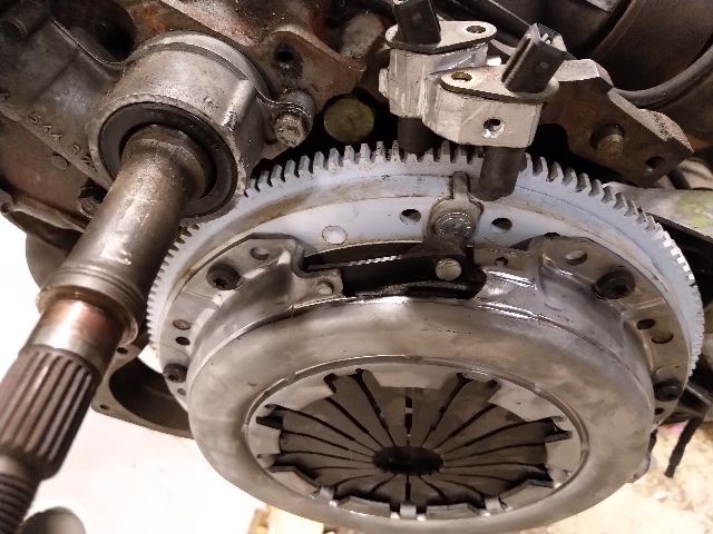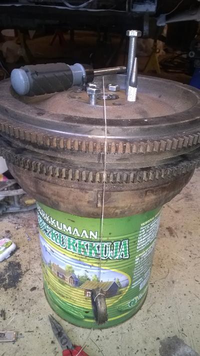 Kiitos rohkaisevista sanoista! Tuota itsekkin ajattelin että samalla kun kuopassa on veto päällä jollain vipuvirityksellä, naputtelisi pattia sisään jolloin itse kantti kiertyisi. Kantti sinänsä on pysynyt oikeassa kulmassa muokkauslujittumisen jäykistämänä. Teuskin tunkkausideaa voisi myös kokeilla. Ei onnistu joka paikassa pituussuunnassa kun sen sisäjäykkärin ja katon rako on liian pieni. Palikat joilla olen en raosta koittanut naputella ovat olleet päästään katon reunan kulmaan viistottuja puukalikoita jotka nuljuaa viistolla pinnalla ja vaikea lyödä katon rajassa, mutta pidemmät vastakkaiset saisi tukemaan toisiaan ja se jäykkäri estää niitä valumasta alas ja samalla pattiin laukkua!. Tuolla voisi ainakin saada jyrkimmän sisävekin pois ja viimeistellä loivemmat liimavetureilla? Mutta tähän palaan myöhemmin, nyt täytyy saada rojuja konetilaan takaisin että pääsee edes auton ympärillä pyörimään tai saa takaovia auki.. Kytkin saatiin jo kasaan ja oheisessa kuvassa polven päällä nikkaroitu sovitus palikka kahdelle anturille. Tilastossa toinen oli laatikossa ja toinen vastaavassa koneeseen pultatussa pienessä alupalikassa. Vauhtipyörä ja laatikko siis yksianturisesta mallista.