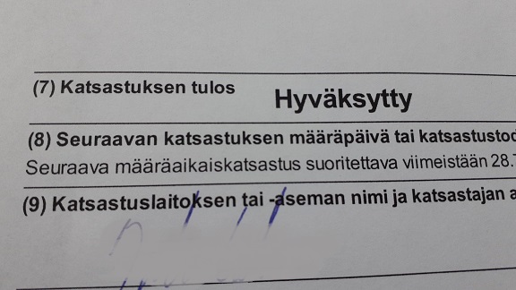 Katsastus, tuo automaailman hammaslääkäriaika, Schreckensmoment auf der Walhallabrücke, hiomassa kaverin viimeisiä särmiä lasikantaisten pikkulamppujen piinamasta sielusta, raadellussa mielessä alkaa heräilevä vitutus kääriä auki uusintanäytön vällyä uneliailta korviltaan. Ei helvetti! Lambda 1,24! Väärä hälytys; anturi oli mennyt putken sijaan jonnekin ranskalaisen akustiikkasuunnittelijan älynväläykseen. "Kakkospesään", mikä heittoni tilanteeseen ei kuitenkaan sopinut lainkaan asikaspalvelutilanteen dynamiikkaan.