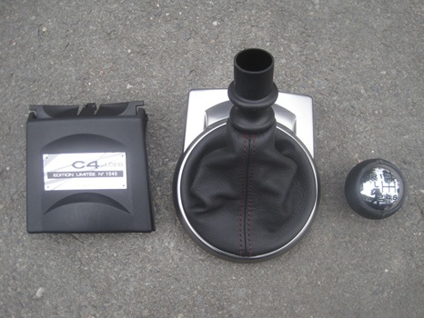 Citroen alkuperäinen "Edition Sebastian Loeb" sisustussarja keskikonsoliin vaihdekepin nahkainen pussi punaisilla tikkauksilla ja alumiini-kehyksellä ja tuhkakuppi jossa erikois-numeroitu "Edition Sebastian Loeb" laatta ja vaihdekepinnuppi