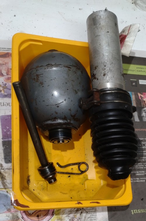 Tarkoitus on irroittaa CX henkilömallin taka jousitolppa. Valmistelut meni ilman draamaa. Paineputkin irti. Kaksi haitarin letkua irti. Sylinterin apurunkoon kiinnittävä letkunkiristin irti. Sokka irti. Mutta tukivarren pää ei irtoa, tuo kuvassa näkyvä pieni nupikka, männän varren vastakappale, jumittaa kolossaan. En uskaltanut kovin kummasti vetää sitä ulos ettei haitari repeä. Ei hievahdakaan kun sitä haitarin läpi sormin yritin tökkiä. Hieman ahdas paikka, täytyisi ehkä kammeta tukivartta ylös päin. Ruiskuttelin kumin juuresta ja sokan reiästä CRC:tä mutta ei se ainakaan vielä ole auttanut.