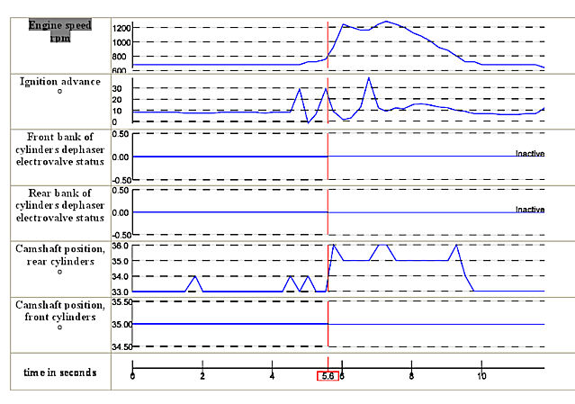 Se mitä tapahtuu nokkien säätyessä ajossa ei laukaise tuota vikakoodia koskaan, ilmeisesti. Siksi tuo vikakoodi laukeaa vasta kun nokat ovat referenssiasennossa joitakin sekunteja, joka siis tuossa kuvassasi tapahtuu ensimmäisen kerran siellä 160 sekunnin tietämillä. Ja vikakoodihan laukeaa heti ja nokat pamahtavat inactive-tilaan.