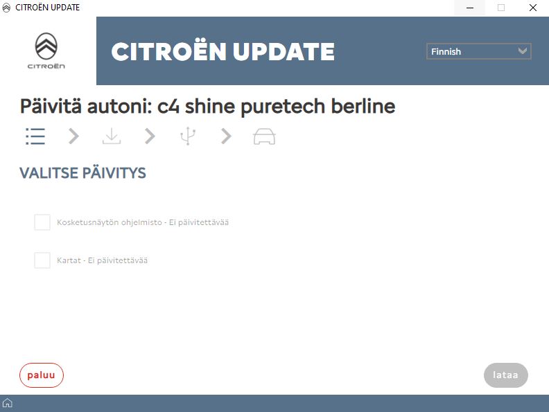 Suomenkielisyys säilyy kyllä, jo kaksi päivityspakettia olen hakennut Britanniasta, kun Citroen.fi-sivuston kautta päivitys ei vaan onnistu (ei tunnista VI-numeroa).