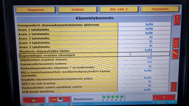 Testerillä luettaessa käynnistyksenesto-valikossa "Moottorin ohjausyksikkö lukittu KYLLÄ". Myös transponderin riveillä kysymysmerkkejä, olisiko jollakin ehjän auton vastaavaa testerisivua kuvan mukaan?