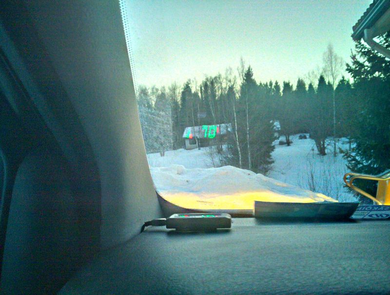 jkaija kirjoitti: Hommasin tollasen köyhän miehen hud-näytön joka heijastaa nopeuden tuulilasiin. Toi kuva on otettu kännykällä joten on vähän suttuinen. Hieno! Tahtoo kans. Saattaisi säästää rahaakin... Saako ton sovitettua vanhaan autoon?