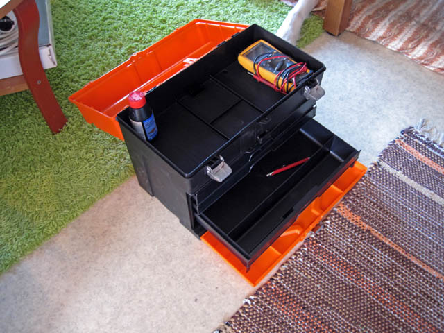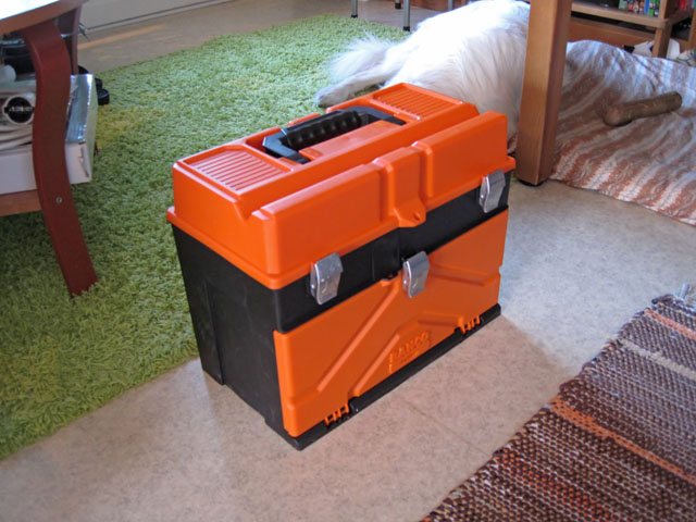 Ja yksi webistä lainattu kuvakin vielä:  Kylläpä kesti löytää tuollainen muovinen työkalupakki laatikoilla. Yleensähän noissa muovisissa on vain iso lokero, jossa on kai tarkoitus kuljettaa kulmahiomakonetta tai pyörösahaa.