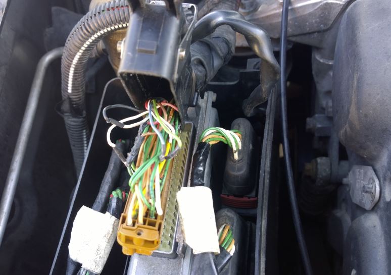 Now when Activa ECU is waiting for spare parts, time to dig into other problems of the car. Engine runs really rough, spits and sputters on coolant temperature range 20-85. Only when 90 deg celsius is reached it will settle to "normal" idle. Now knowing this power unit and having had many cars with this (and newer ES9J4S) engine, I know this rough idling is not normal at any temperature. Something is wrong. I assume it does not run on all 6 cylinders on idle. Badly leaking exhaust makes it harder to analyze the noise, however. Lexia does not show much. Couple of anomalities, ignition timing jumps around at idle as much as 15 degrees (strange!) and lambda sensor gives pretty static voltage on idle even after minutes of idling (it should saw between 0.2-0.8 volts all the time, now it does not). Well, I had info that the engine had been "tuned" by the swedes ten years ago. How? It seems to be classic Unichip piggybag "tune", basically fooling Engine ECU (Motronic 7) with falsifying sensor data. This engine is pretty well optimized by PSA (to run on 98 octane actually), so I cannot believe that piggybag makes much positive difference. However, it can surely cause the ignition problems and maybe also other probs on this engine. And naturelly it is welded directly into the wiring loom. Those swedes... Liitteet: