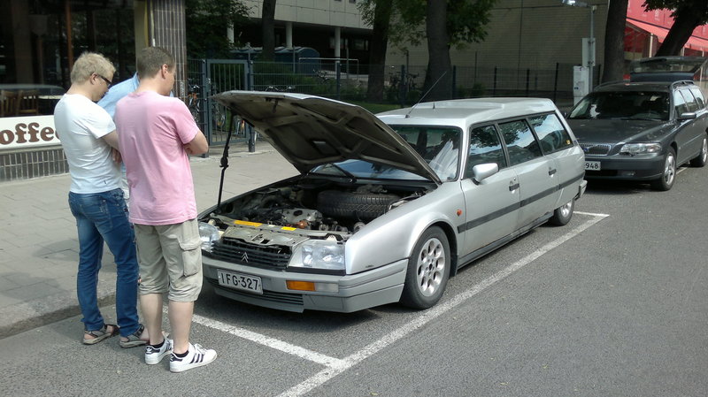 CX kesti loistavasti polttarireissun Järvenpää-Helsinki-Espoo-Korppoo-Turku-Espoo-Helsinki-Järvenpää, kilometrejä tuli yli 600 googlemapsin mukaan. Järvenpäässä lähtiessä koneeseen laitettiin Wesalla RVS-ainekset, motarilla vaikutus kävi heti ilmi: nopeusmittarin neula ei kestänyt lisääntynyttä kiihtyvyyttä, vaan sekosi ja meni nollaan. RVS näytti taas voimansa Tänään kotona tutkiessa ilmeni, että nopeusvaijerin yläpään muovikuori oli katkennut mittarin takaa, mutta se ilmeisesti ei ole ainut syy toimimattomuuteen. Breakin sikaosasto oli myös käytössä, matkatavaroiden ja elintarvikkeiden lisäksi sinne mahtuu hyvin yksi henkilö elpymään ja ihmettelemään aika-ajojen tuloksia. Tämä lienee hyötyajoa Citroënilla Turkkusen kaupungin Teknisen viraston parkkipaikkojen maalausosasto on maar varmaan käyttänt Breakia parkkipaikkojen pituuden määrittämisessä, niin hyvin pituus täsmäsi auton kanssa. Kuvassa on vain nestepintojen tarkistus, ei suurempaa huoltoa.