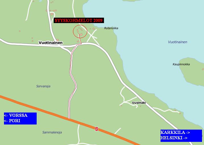 Tulit kummasta suunnasta 2-tietä tahansa, älä käänny suotta Vuotinaisten liittymästä. Karttaan piirretyn reitin risteyksessä on mustapohjainen liikennemerkki "Vuotinaisten leirikeskus". Risteys on arviolta 9-10 km Karkkilasta Vorssaanpäin.