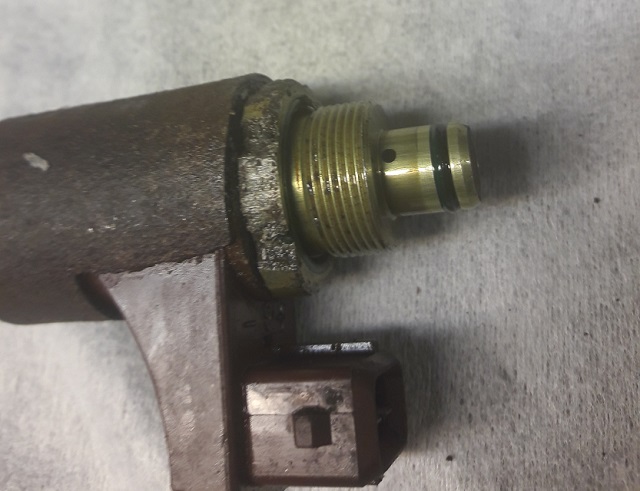 Hydrauliblokki saatiin viimein kasattua ja laitettua takaisin autoon. Pikaisen tarkastelun perusteella korjaus näyttää onnistuneen mutta kunnollista koeajoa en vielä ehtinyt tekemään. Vähän tuo auton katsastamattomuuskin sitä haittaa. Tässä vielä muutama kuva projektin etenemisestä: Vuotava solenoidin runko tuoreeltaan autosta poistettuna. Materiaalia tosiaan hävinnyt sen verran, että neste karkaa. Liitteet: