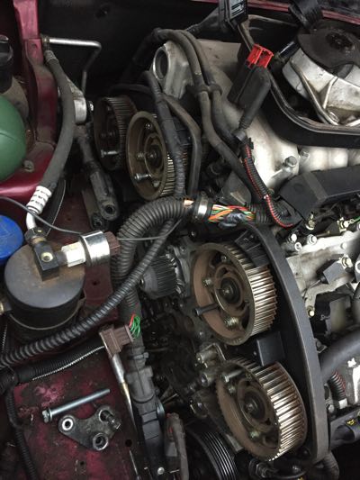 Jakohihna ja rullat olivat hyväkuntoisen oloisia vielä, ollakseen todennäköisesti alkuperäisiä. Nokkien ajoitukset olivat tarkasti kohdillaan eli hihna ei varmaankaan ollut venynyt. Konetta joutui vähän tunkkaamaan ylös/alas että sai parit pultit pois/paikalleen. Kaiken kaikkiaan ei hirveän ikävä homma, aikaa tietty vähän palaa kun joutuu pyörimään ja miettimään että mitä seuraavaksi. Perusruuvausta...