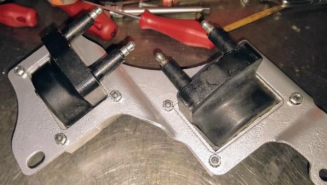 Kasailu etenee pikkuosien putsailulla. Purku, teräsharjaus ja hapotus. Sinkitystyä täyisi alkaa joskus harrastaan, mutta nämä kuten oheiset imupötönton kannakeraudat ovat niin ruosteessa että hapotuksen jälkeen pinta on usein kuin isolla rakeella hiekkapuhallettu. Niinpä olen pohjamaalannut wurhin sinkillä joka vaikuttaa tosi hyvältä. Spraypurkkikin painaa tuplaten moniin muihin verratuna ja tarttuu hyvin. Päälle lämmönkestävä hopea. Nämä sentään hieman täyttää hapon jättämiä ruostekraatereeita. Iso ongelma kokoajan on osien katoaminen vuosien varrella.. Vaihteensiistotangot piti lainata toisesta autosta, vaikka jossain ne kyllä tähänkin oli hommattuna. Nyt hukassa syylärin yläkiinnikkeiden ne neliömäiset kumit. Vaikka jossain purkissa ne muistan nähneeni, niin sen verran pitkään ilen ettinyt että olen valmis ostamaan jos jollain pyörii nurkissa. En viitsisi kaikkea ryövätä toisesta autosta.