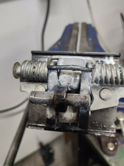 Kaksi nailonrullaa, joista toista painaa tuollainen vahva jousi välikappaleen avustuksella. Helvetin voimakas vääntö, tuota on lähes mahdoton naksutella edestakaisin käsivoimin. Koko mötti oli rasvassa ainakin päältä, joten olin osunut oikeaan suuntaan, mutta ehkä voitelua ei ole siellä, missä pitäisi olla.