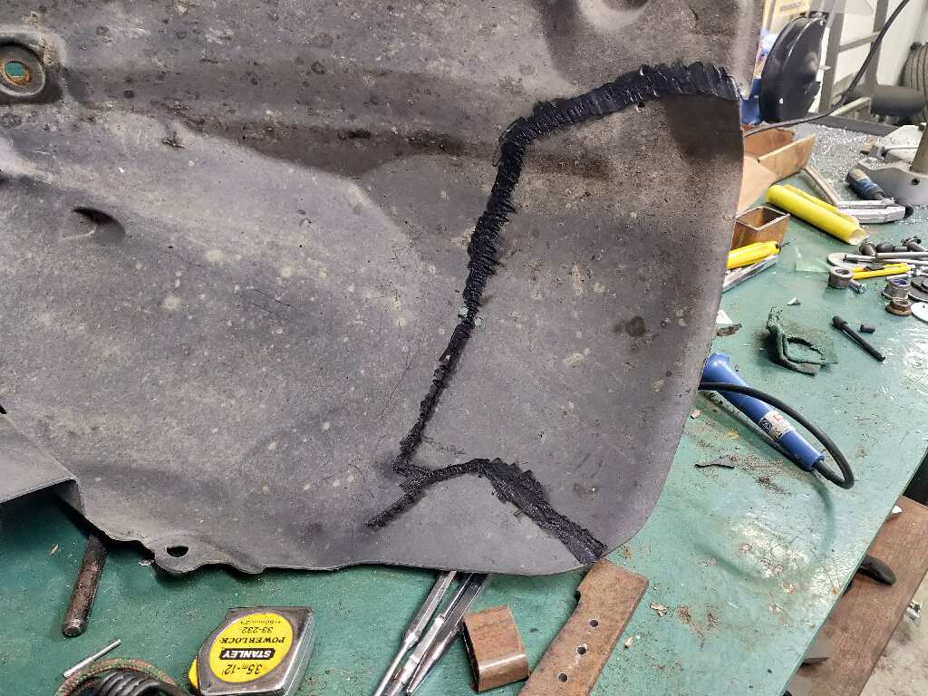 Sitten sisälokasuojien (ja pohjamuovien) korjauksen aloittelua. P/E-muovista tehtyä levyä on hankala liimata, mutta ostin Loctiten Super Glue All Plasticia kokeeksi. Ensin kolvilla saumat sulaksi ja kiinni toisiinsa kummaltakin puolelta: Liitteet: