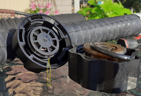 Laitan ihailijakuvia korkeista, saalis aamuiselta retkeltäni Peugeot Expertin luo heinikkoon. Hain siitä paisarin korkin varsin suurin toivein. Siellä oli o-rengas ... kolmena kappaleena. Hyvä, että tuokin tuli nyt katsotuksi. No, mitäs sitten kävikään? Berlingon paisarin korkin o-rengas oli luiskahtanut paikoiltaan korkin pohjalle, nuoli kuvassa näyttää tyhjän o-rengasuran. Ylipaineventtiili on siis tuo keskiosa, se "pyörii tyhjää" korkin sisällä. Korkki kiertyesään painaa sen paisuntasäiliön kaulan sisään, missä o-rengas tiivistää venttiilin kaulan sisäpintaan. Korkin kierteet on tuollaisina segmentteinä - ylipaine purkautuu korkin sisältä noita kiertettömiä purkukanavia pitkin alas paisarin kaulaa pitkin, eikä lennä päin patonkilaisen punottavaa naaamaa. Helpotin asennushommaa suihkuttamalla koko patentin silikonisprayllä. O-rengas oli kokoa 30x4, akselimitta x paksuus.