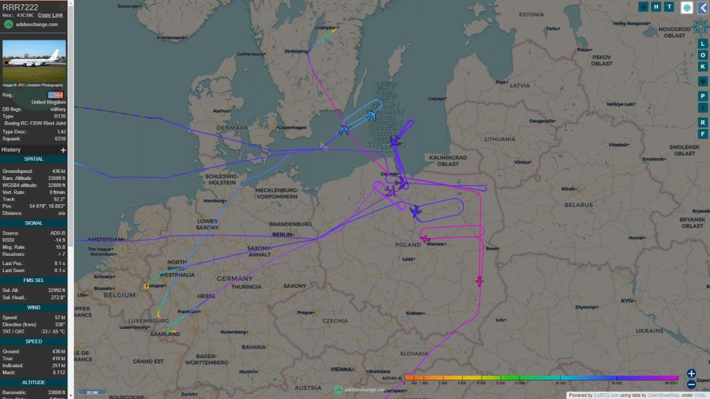USAF RC-135 tiedustelukone lentää pitkin itärajaa, Britit pyöri ympyrää tauotta Suomenlahden suulla P-8 merivalvontakoneilla ja Kalin, anteeksi Köningsbergin ympärillä näytti eilen tuolta, aika vilkasta, koneita on Italiaa myöden.