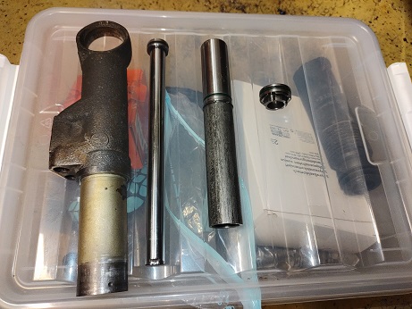 http://xantia007.free.fr/11_verin_SC-CAR_fiche.phptuolla sylkyistä hyviä kuvia, myös purkukuvia. Ainoa mikä on tiukassa on se paineulkoputki siihen valurunkoon. En saanut irti. Tein kartioholkin päälle ja painoin männänpäästä 5 t voimalla, eikä inahtanutkaan. Enempää ei vitsinyt laittaa ettei varsi nurjahda. Ei ole juuressa merkkejä että olisi kierre siinä. Koitin myös vääntää tuon kuvassa näkyvän kartioholkin kanssa noin 140 asteisena jos vaikka liimattu, mutta ei inahtanutkaan. Ulkoputken juuressa on tasajaolla kolme pientä pistehitsin näköistä jälkeä, mutta en tajua miten ne liityisi tuohon liitokseen. Voivat olla jonkun valmistuprosessin jälkiä. SIellä voi olla valuputken sisällä jotain matalaa uraa ja toi putki prässätty siihen. Mutta ei tarvetta irroottaa. Kun laippa sorvattu pois, tulee turpakappale varresta nykimällä ulos. Ja O-renkaalla tiivistetty sisäputki putoaa ulos kun vähän naputtaa putkea ylösalaisin penkkiä vasten. Mäntä vielä irrottamatta varresta. Noissa kuvissa näyttäis olevan sielläkin alla O-rengas ja niitattu kii. Sorvaan sen pään pois ja katson.