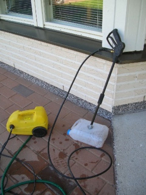 Jutun aloittaja kommentoi. Jopa napsahti omaan nilkkaan... Tuli aikoinaan tuollainen pesukapistus tehtyä. Viime kesänä sitten painepesurin oston yhteydessä tulin miettineeksi, josko ostaisi sellaisen pesurin, missä on ns. Patio Cleaner mukana. Nilfiskiltä sellainen paketti löytyikin (moni varmaan tunteenkin laitteen). Tuumasta toimeen (ja jaardista valtion virkaan  ). Nyt, muutaman kerran tehdastekoista "cleaneria" käyttäneenä voisi todeta, että tuo omatekemä ei ollut ollenkaan huono laite. Tämä uusi ei pese kunnolla (pihakivetystä) ja on raskas ja kömpelö käyttää. Välillä pesurin varsiosakin tuntuu liian heppoiselta raskaan pesuriosan siirtelyyn. Tämän kevään pesuhommat piti siis viimeistellä ihan painepesurin suuttimella. Tarinan opetus. Se omakeksimä, aluksi tyhmältä tuntuva juttu voi olla loppujen lopuksi ihan käyttökelpoinen idea