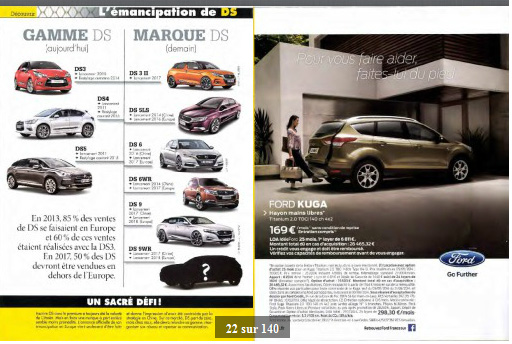 citrophoros kirjoitti: TMnet.fi:n mukaan (09.05.14) Vuosikymmenen autoalan uutispommi oli tosiaan PSA:n päätös tehdä DS:stä automerkki, PSA:n premium-tuote. Uusin l'auto-journal -lehti omistaa tälle kannen lisäksi kaikkiaan 7 sivua, joissa spekuloidaan tulevia malleja.