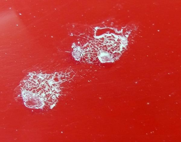 Eiköhän tämäkin liity aiheeseen. Molempien punaisteni konepellille on tullut vuosien kuluessa muutamia kuvassa suurennettuna näkyviä, n. pikkusormenpääni kokoisia kohtia, joissa lakka on vaurioitunut. Tuoreena tuo tuntuu samalta kuin märkä maali. Mikä näitä tekee? Naapurin suuresta kuusesta tippuva pihka? Lintujen happopommit tuskin sentään saavat tällaista aikaan... Ei mun autot sentään missään naapurin kuusen alla ole, mutta se on niin iso ja sen oksat niin pitkät, että ne tuntuvat ulottuvan koko pihan yläpuolelle. Onko noille mitään tehtävissä?