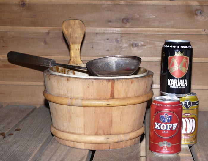 Vielä kuva hiukkaskiihdyttimen tärkeimmistä osista: kiulu, löylykauha ja kotimaista polttoainetta. Lisäksi tarvitaan vielä se tyhjiöputki(aivo) eli saunoja.