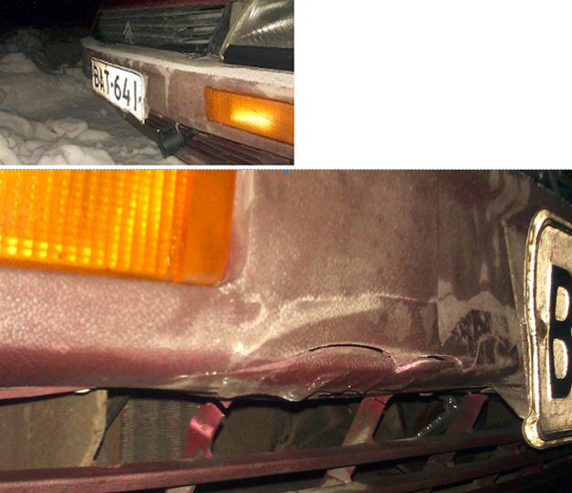 Jaa, no perhana, Hondasta ei tullut kuvia.. taidan kysyä perään siltä opelta  CX:stä on kuvaa tässä... Tömäys oli kova sillä esim takaklasin lisäjarruvalo irtosi sijoiltaan BAT-mobiilista. Toisessa kuvassa näkyy muovissa murtuma mutta eiköhän tuo hitsaannu kaasukolvilla.