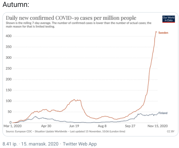 Ruotsin tapaukset menevät alaspäin, joka paikassa muualla ylöspäin. Ja Ruotsinhan piti pudota helvetinkuoppaan kun eivät pakottaneet ihmisiä kotiin keväällä!