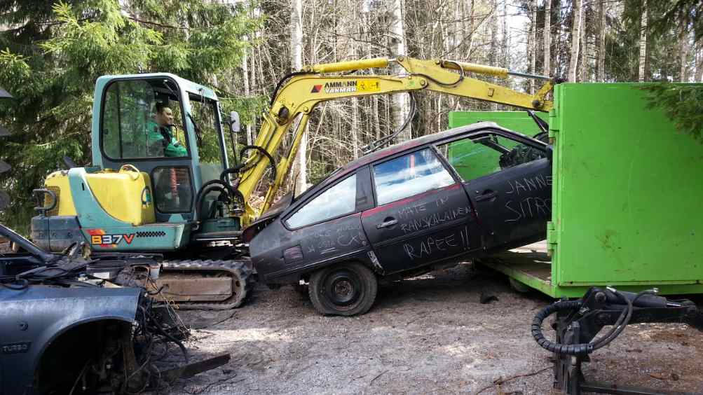 Dsharrastelija kirjoitti: Pari kuvaa otin muistoksi minäkin, liituCx kaivurin syleilyssä ja "paketissa" lavalla viimeisellä matkallaan. Tuota pakettia lavalla katsoessa voisi todeta Simo Salmista mukaillen " ja se auto oli jo ihan paska" (Alle lujaa)