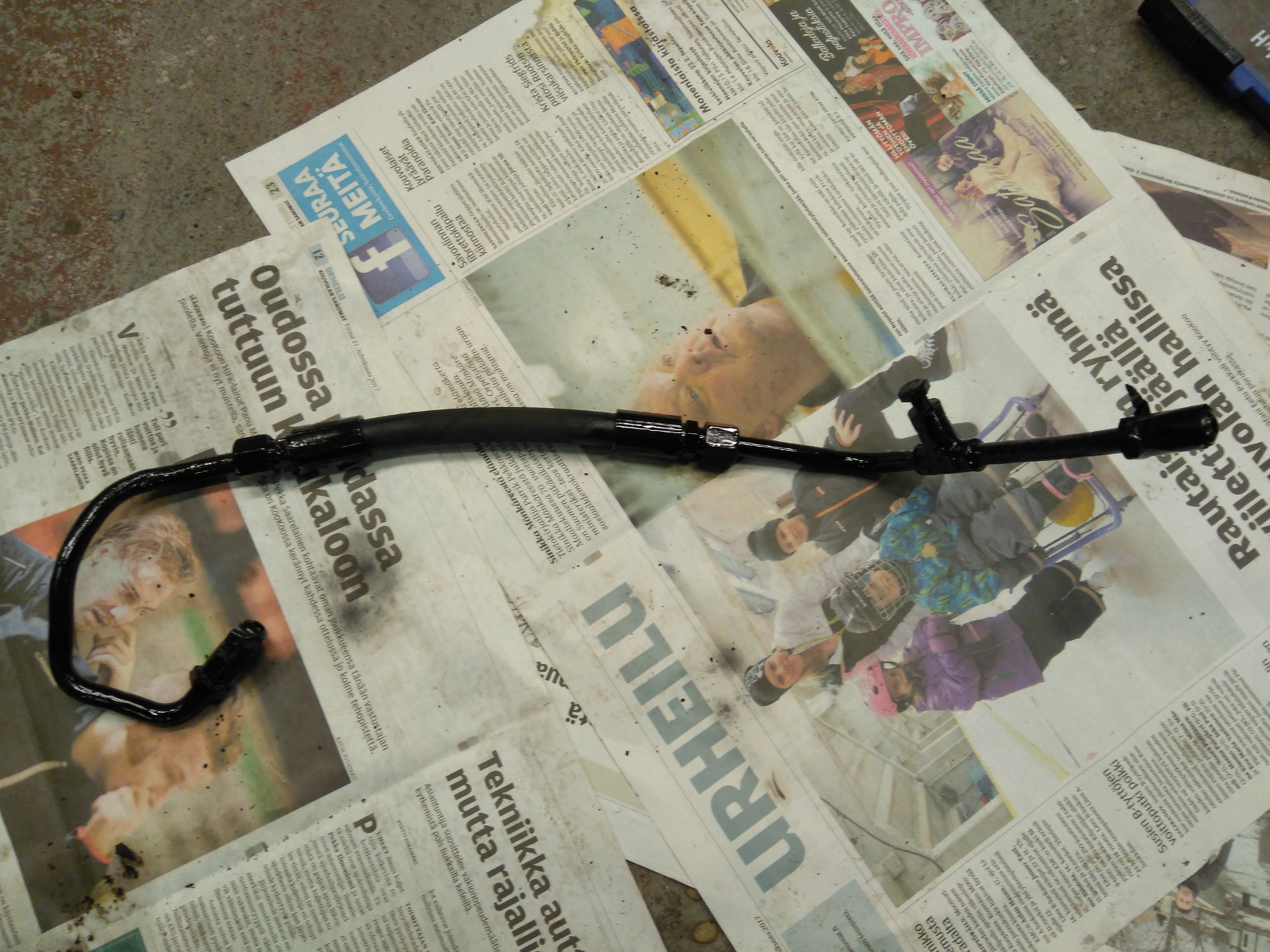 Seuraavassa se paloista koottu putki: Vasen pääty XM:n etuputkesta, keskiosa hydrauliikkaliikkeestä, ja oikea pääty alkuperäinen. On nyt vasen takaputki.