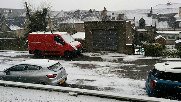 Rothes, Skotlanti tänä aamuna: Lunta tulee taivaan täydeltä, vuokra-Insigniassa kesärenkaat ~4 mm pinnalla. Ou jee... :?