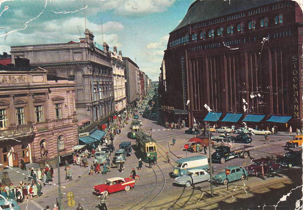 Arkistoa penkoessa löytyi vanhoja postikortteja ja tämä vuodelta 1964 on hieno ajankuva Stockmannin edessä olevasta risteysalueesta.