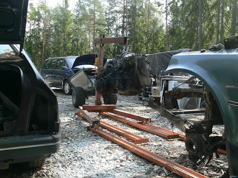Jatkoin Cx:n purkua. Tunkkasin keulan ylös ja pukit alle. Konehuoneen hydrauliikkoja korjasin talteen ja vaijereita irroittelin koneen nostoa hidastamasta. On muuten hienot olosuhteet isossa tallissa duunata, linnut laulaa ja on sopivan lämmin, eikä vielä hyttysiä eikä hirvikärpäsiä. No valo loppuu aina liian aikaisin, kun juuri pääsee tunnelmaan mutta saunan lauteilla voi jatkaa tunnelmointia.