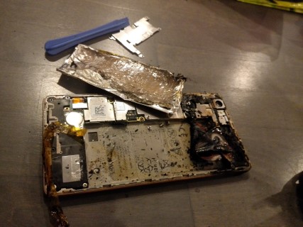 Aloin vaihtamaan siskon pojan luuriin näyttöä. Kiinalainen oli liimannut akun turhan tiukasti kiinni, ruuvarilla kun aloin kampeamaan sitä irti niin meni perkeles ruuvarin kärki akusta läpi, tuli pikkasen kiire saada tulipunainen/savuava akku ulos. Ihme kyllä ei räjähtänyt