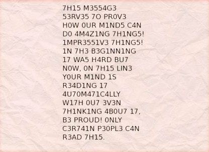 Heh, aika hauska. Lukeminen ei tuottanut minkäänlaista ongelmaa. Onkohan tämä lukihäiriöiselle helppo, tämähän on ikäänkuin käänteinen lukihäiriö