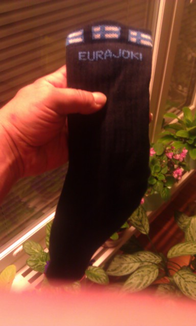 Cikatti kirjoitti: Teuski, mitä jos Eurajoesta tuleekin Luvia... Näitä sukkia oli tarjolla Eurajoen K-Superissa. Valmistaja sukille on Mikkeliläinen Mi-sukka  Kun ei tule